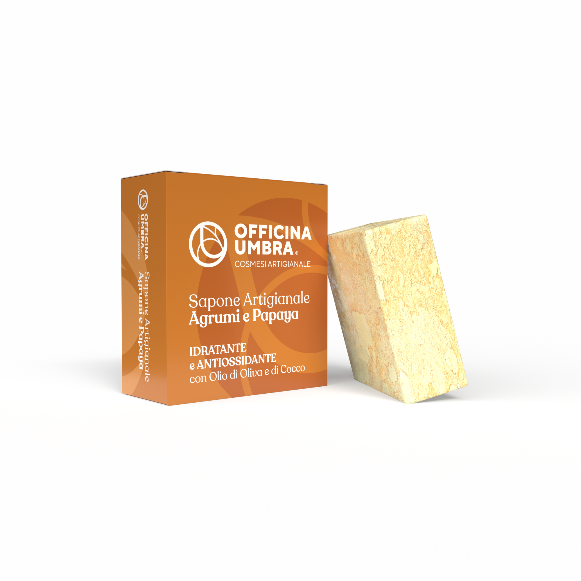 Sapone solido ad azione idratante ed antiossidante a base di Olio di Oliva, Olio di Cocco ed estratti di Papaya ed Arancio Dolce. Ideale per nutrire giornalmente la pelle.